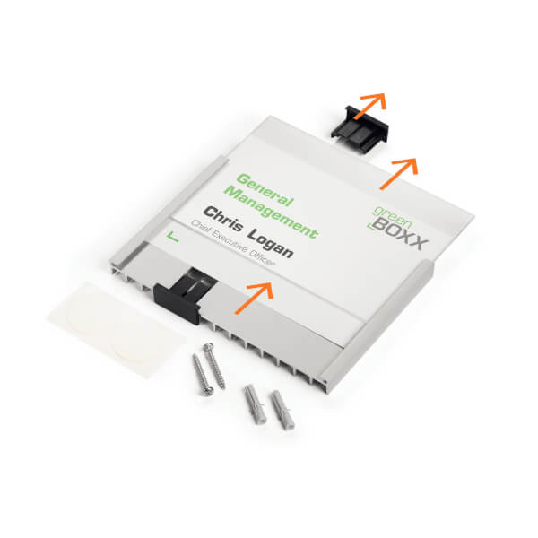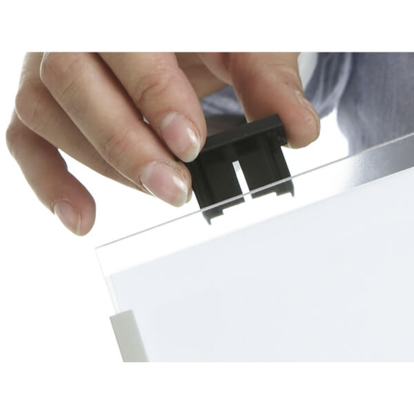 - einfacher Wechsel der Beschriftungseinlagen durch Abnehmen des Clips und Hochschieben der Acrylglasscheibe