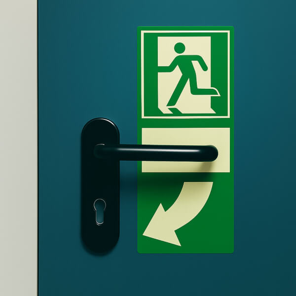 Eine Türgriffhinterlegung lässt Türklinke sowie Öffnungsrichtung sofort erkennen. Das selbstklebende Schild wird so an die Tür geklebt, das der Pfeil auf die Türklinke zeigt. In der Dunkelheit sorgt das langnachleuchtende Material des Schildes dafür, dass die Türklinke direkt zu identifizieren ist und keine unnötige Zeit für das Auffinden verschwendet wird.