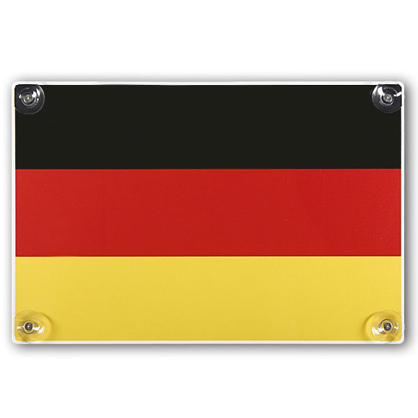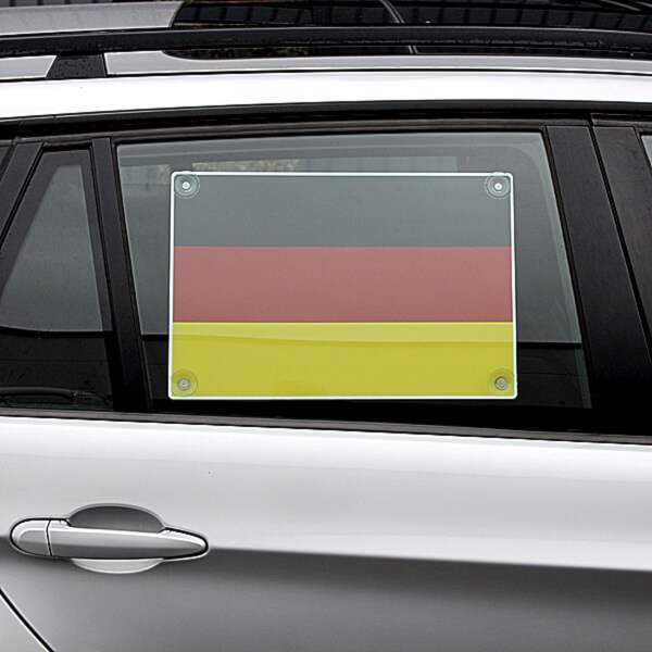 Das Set besteht aus zwei Deutschlandfahnen auf PVC - Größe (BxH): 45,0 x 30,0 cm - und wird inklusive Saugnäpfe geliefert.