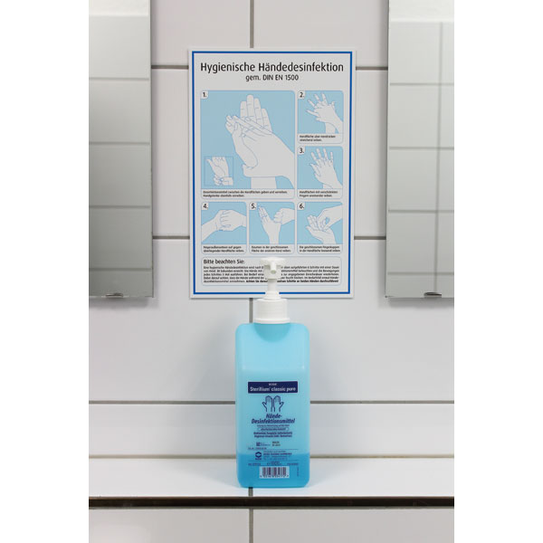 Einfach, sauber und sicher! Die häufigste Übertragung von Erregern und Infektionen passiert über die Hände. Mitarbeiter, die mit viel Patienten- und Lebensmittelkontakt arbeiten, müssen eine fachgemäße Händehygiene durchführen, um effektiven Schutz für sich und andere zu garantieren. Die 6 Schritte des Planes helfen dem Personal mit Schrift und Bildern in Waschräumen und an Desinfektionsmittelspendern ihre Hände adäquat zu desinfizieren: