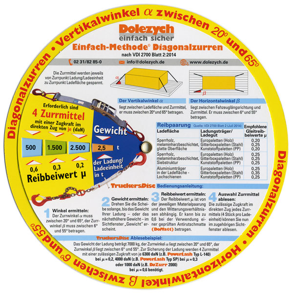 Diagonalzurren: Beachtung des Horizontalwinkels und des Vertikalwinkels, verschiedene Gleitreibbeiwerte und der zu sichernden Last. Einfaches Ablesen der erforderliche und zulässige Zugkraft des Zurrmittels.