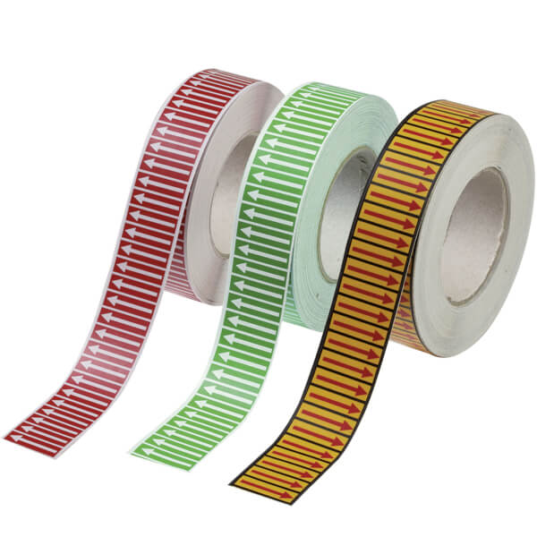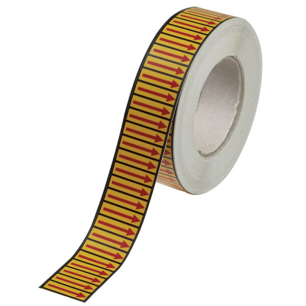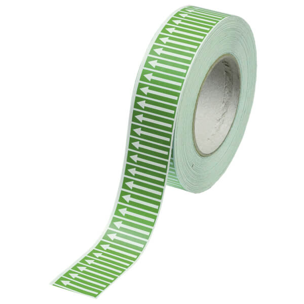Dauerhafte und gut erkennbare Kennzeichnung der Fließrichtung von Durchflussstoffen. Die selbstklebende Folie ist extrem Temperaturbeständig und durch die zusätzliche Laminatschicht gegen mechanische Beanspruchungen geschütz. Die hohe Qualität der verwendeten Materialien und Farben sorgt für eine lange, gut sichtbare Kennzeichnung