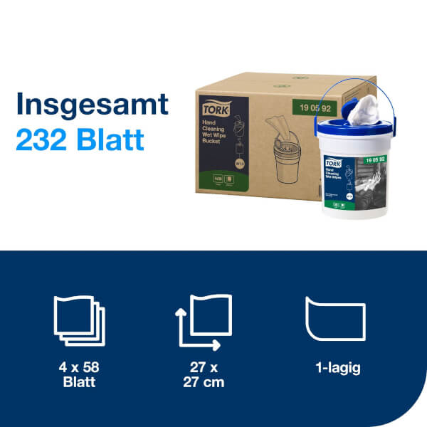 Die feuchten Handreinigungstücher von TORK® sind ideal, wenn am Einsatzort kein Wasser zur Verfügung steht, hier kommen die Tücher gebrauchsfertig im praktischen Eimer und sorgen für eine einfache Reinigung der Hände an allen benötigten Stellen.