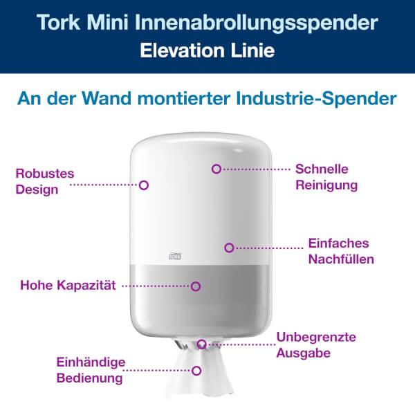 Der Tork Mini Innenabrollungsspender im Elevation Design ist eine kompakte, vielseitige Lösung für professionelle Umfelder, in denen sowohl Hände als auch Oberflächen abgewischt werden müssen.